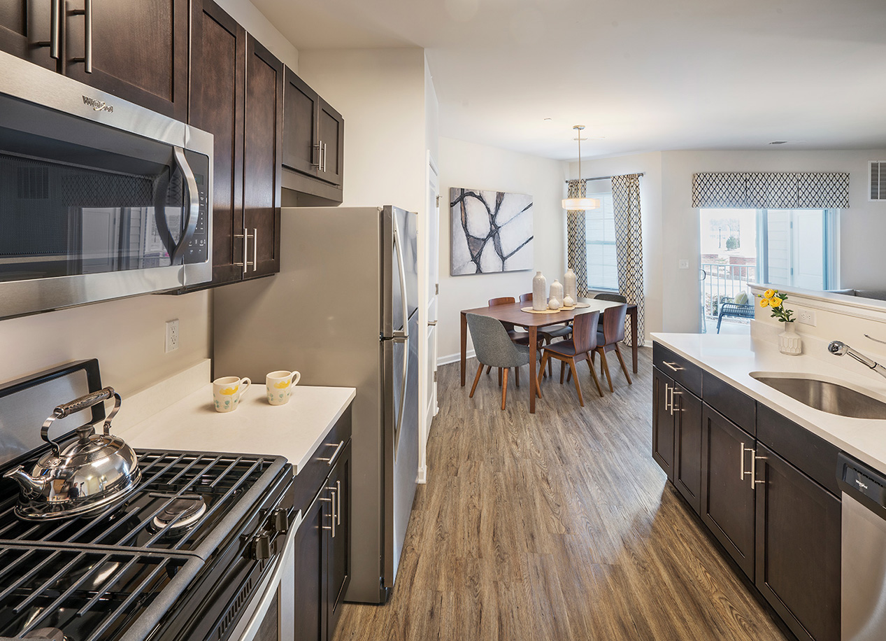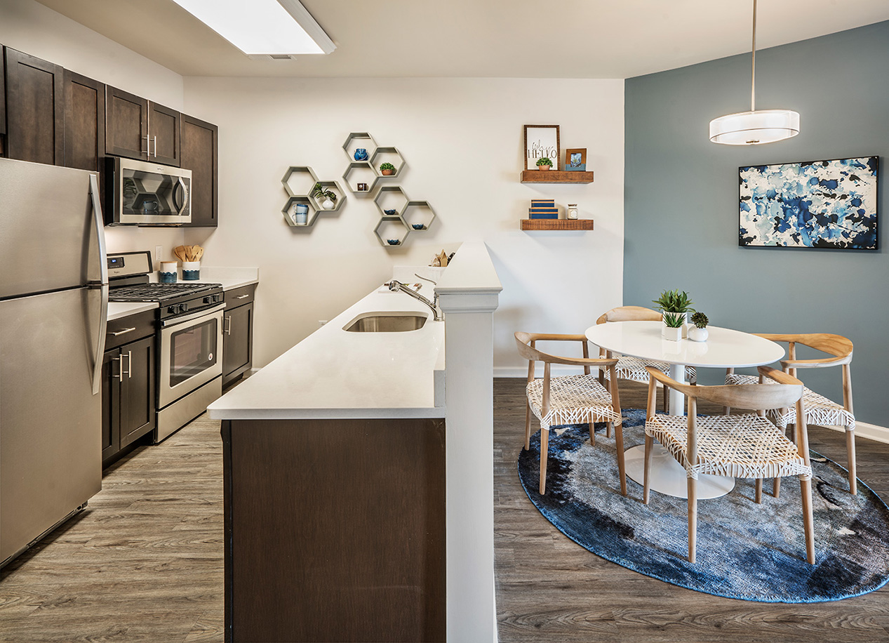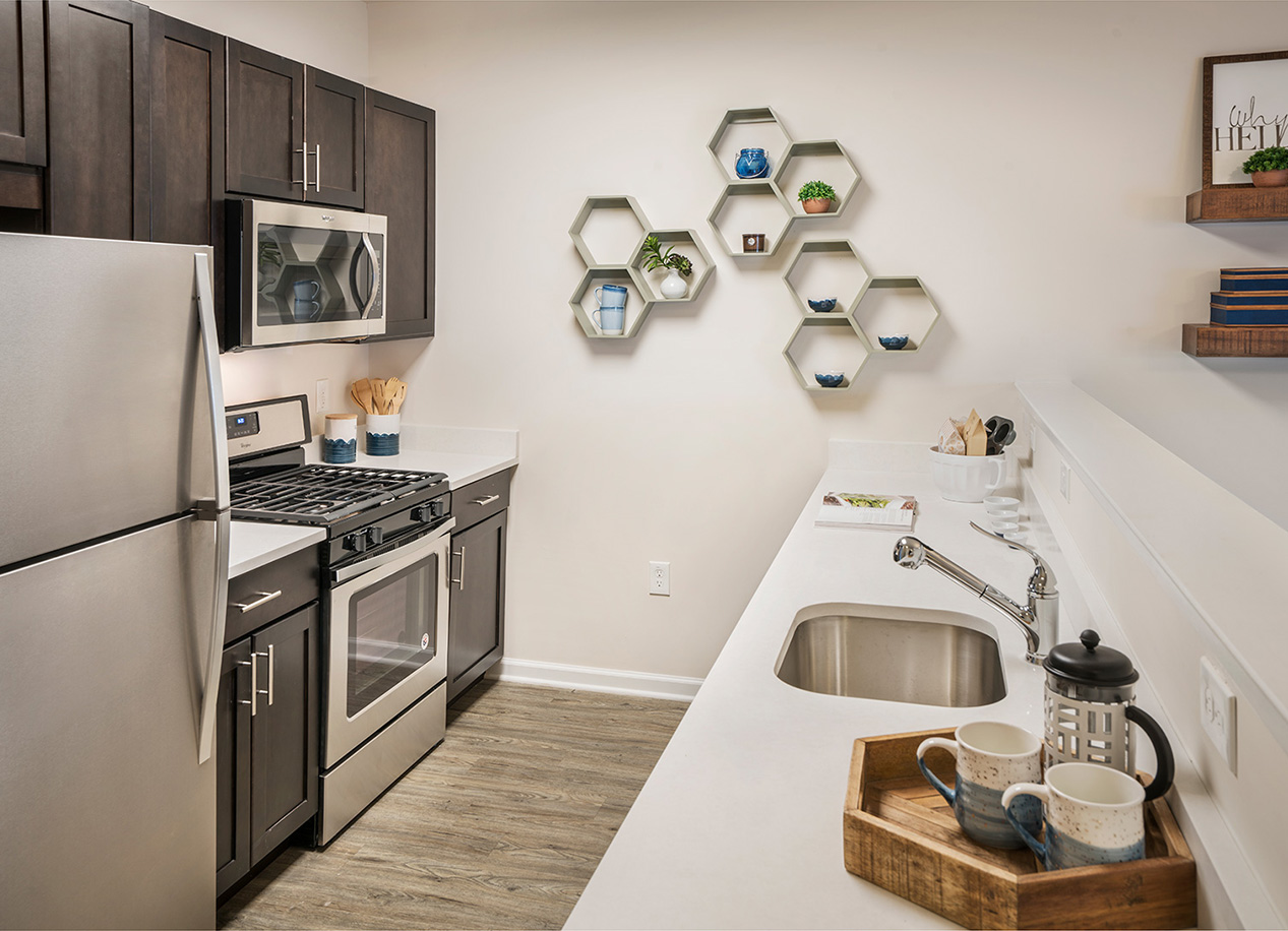 • Sleek kitchens with quartz countertops